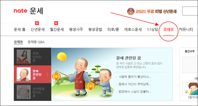 이곳에서는 여러 가지 운세 서비스를 제공하고 있어요. 메뉴를 보면 타로, 궁합, 사주 등 재미있게 볼 수 있는 역술 서비스가 보이는데요. 다음에 이용해보시고, 이번 시간에는 무료 꿈풀이를 보기 위해 가장 우측에 있는 꿈해몽을 클릭해볼게요.