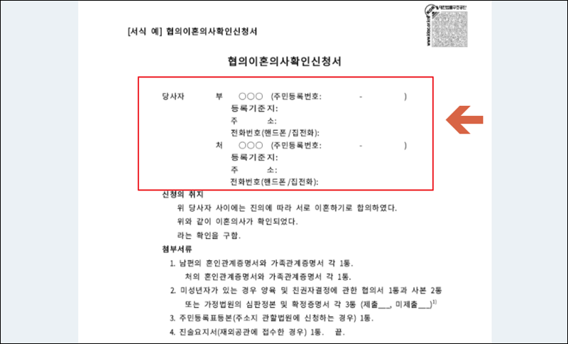 해당 양식을 보면 준비해야 하는 이혼서류에 대한 내용이 포함되어 있어요. 합의 이혼의 경우 혼인관계증명서, 가족관계증명서, 양육 및 친권자결정에 관한 협의서, 주민등록표등본, 진술요지서 등을 마련해야 하는데요. 상황에 따라 준비해야 하는 이혼서류가 다를 수 있어요. 그렇기 때문에 근처 가정법원에 방문하기 이전에 전화로 문의해보는 것이 좋아요.