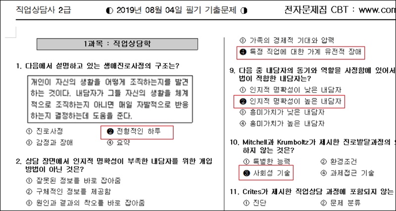 미래 사회에는 일자리가 점점 다양해진다는 이야기가 있어요. 그만큼 자신에게 딱 맞는 일자리를 찾으려는 구직자가 늘어날 거라고 생각이 되는데요. 이를 도와주는 직업이 있어요. 바로 직업상담사에요. 해당 직업을 준비하는 경우라면 자격증이 필수인데요. 인터넷 사이트를 통해 직업상담사 2급 기출문제 자료를 쉽게 얻을 수 있어요. 더 나아가 해설집도 제공이 되기 때문에 독학을 하기에도 정말 좋아요.