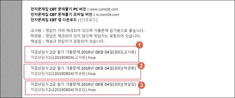 풀어보고 싶은 회차의 게시물을 클릭해 보세요. 그럼 이렇게 3가지 파일을 발견할 수 있는데요. 동일한 직업상담사 2급 기출문제 자료이지만, 각 자료마다 조금씩 다른 점이 있어요.