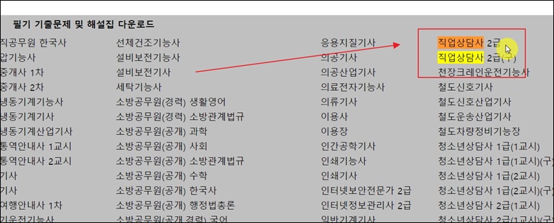 사이트 메인화면을 보면 필기 기출문제 및 해설집 다운로드 리스트가 나타나는데요. 여기에서 "직업상담사 2급"을 찾아주세요. 자격증 리스트에서 우측 상단을 보면 쉽게 찾을 수 있어요.