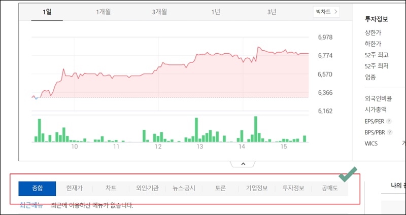 여기서는 전종목을 한 번에 알아보는 것과 반대로 살펴볼 수 있다고 보면 돼요. 다음증권에서는 개별 종목에 대하여 굉장히 깊이 있는 정보를 제공하고 있는데요. 아래 메뉴를 보면 종합, 현재가, 차트, 외인, 기관, 뉴스, 공시, 토론, 기업정보, 투자정보, 공매도와 같이 부문별로 심도 있게 살펴볼 수 있어요.