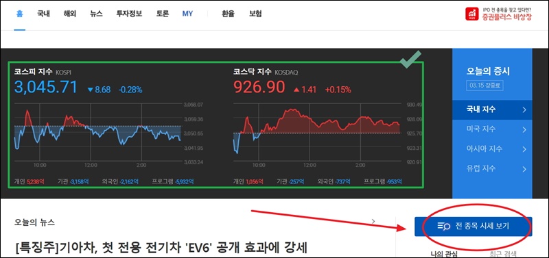 다음증권 홈페이지에서 우측 중앙을 보면 전종목 시세 보기 버튼이 있는데요. 해당 버튼을 클릭해 보세요.