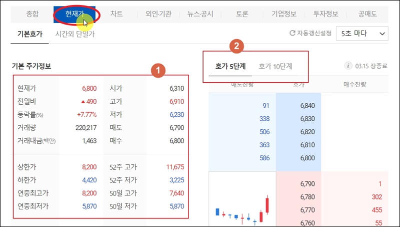다음증권의 현재가 메뉴의 경우 해당 종목에 대한 시세 정보를 자세히 알아볼 수 있는데요. 기본 주가정보는 물론이고, 우리가 주식투자할 때 자주 보는 호가 5단계와 10단계 확인도 가능해요.
