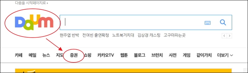 현재 주식시장에 상장이 되어 있는 전종목 시세를 보기에 앞서 다음증권 사이트에 접속해야 해요. 다음 사이트에서 보면 여러 가지 메뉴가 보이실 텐데요. 여기에서 5번째에 위치한 증권 메뉴를 클릭해 주세요.