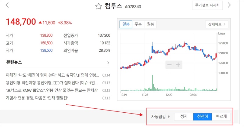 돌려볼 때 직접 클릭을 해도 되고, 자동 넘김 기능을 사용해도 돼요. 시세 정보, 실시간 차트와 함께 관련 뉴스 확인도 간단하게 할 수 있어요. 더 자세한 정보는 "주가정보 자세히" 버튼을 클릭해 보세요.