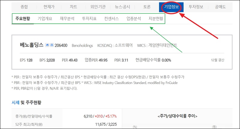 특정 기업에 대한 정보 확인도 가능한데요. 기업개요, 재무분석, 투자지표, 컨센서스, 업종분석, 지분현황 등 유용한 정보를 많이 제공하고 있어요.