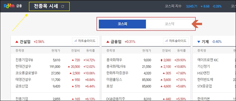 우리가 이번 시간에 이용하고자 한 다음증권 사이트의 전종목 시세 서비스 페이지가 열렸어요. 코스피와 코스닥에 포함된 전종목에 대한 시세 정보를 한눈에 볼 수 있도록 되어 있는데요. 업종끼리 묶여 있어서 특정 업종에 대한 시세를 파악하는 데에도 안성맞춤이에요.