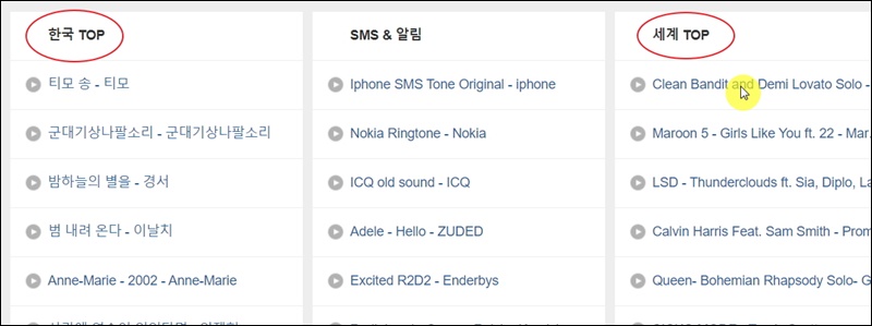 AUDIKO 사이트에 접속했어요. 메인화면을 보면 한국과 세계로 나뉘어진 벨소리 음원 TOP을 확인할 수 있는데요. 아무래도 순위가 높은 곡이 괜찮은 가능성이 높아요.