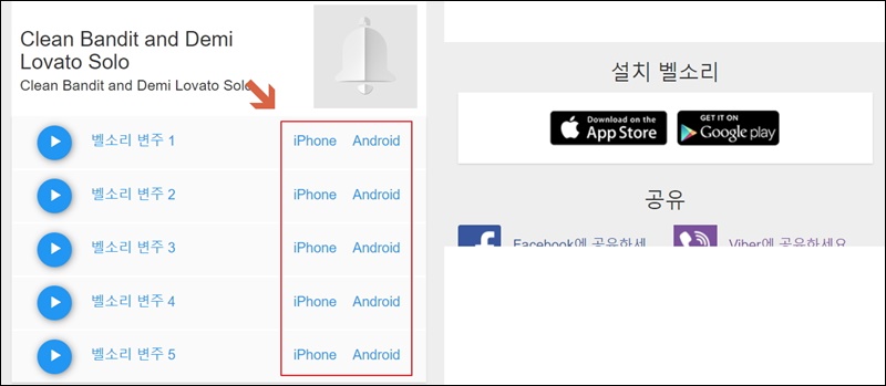 저는 세계 TOP에 속한 Clean Bandit and Demi Lovato Solo 곡을 선택해 보았어요. 해당 곡으로 만들어진 벨소리 변주가 5개나 되네요. 아이폰과 안드로이드 버전으로 다운받기 가능하오니 본인이 사용하고 있는 기기에 맞는 것을 선택해주세요.