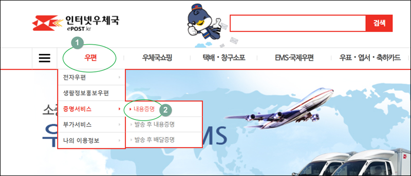 인터넷 우체국 사이트에 접속했어요. 이곳에서는 우편, 택배, 소포 등을 보내거나 쇼핑을 할 수 있도록 여러 가지 서비스를 제공하고 있는데요. 우리가 찾는 내용증명 무료서식의 경우 메뉴에서 "우편", "증명서비스", "내용증명"을 차례대로 클릭하면 만나볼 수 있어요.