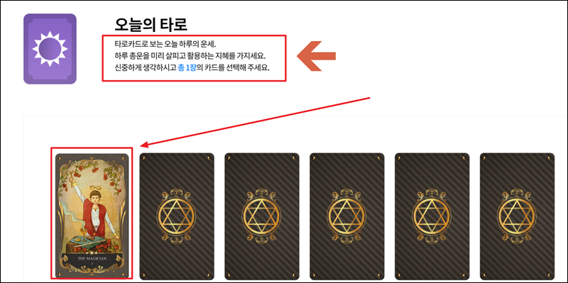 그럼 오늘의 타로카드 점을 보도록 할게요. 해당 서비스를 통해 오늘 하루의 운세를 살펴볼 수 있다고 하는데요. 신중하게 생각한 후에 1장의 카드를 선택하면 돼요.