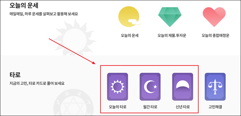이곳에서 제공하는 운세 서비스는 20가지 정도 되는데요. 그 중에서 타로카드를 이용한 운세 서비스는 4개에요. 타로가 아니더라도 오늘의 운세를 볼 수 있으니 참고해 주세요.
