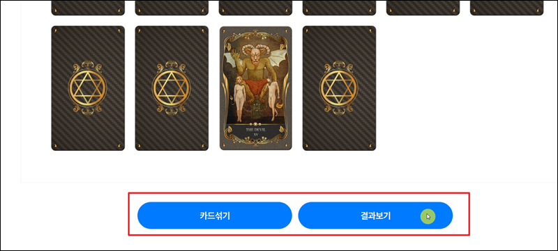 마우스 클릭을 잘못해서 타로카드를 잘못 선택할 수 있어요. 이러한 경우에는 "카드섞기" 버튼을 누르면 되고요. 신중히 제대로 뽑았다면 "결과보기"를 클릭해 주세요.