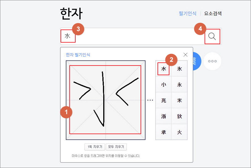 검색창 아래에 열린 한자 필기인식 창에 모르는 문자를 그려 보세요.