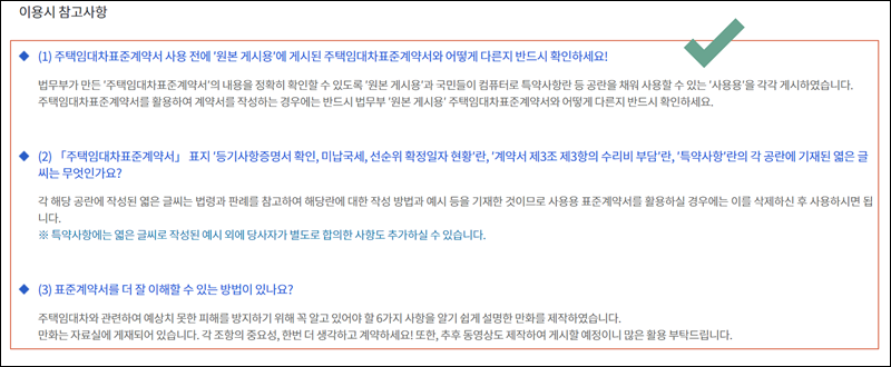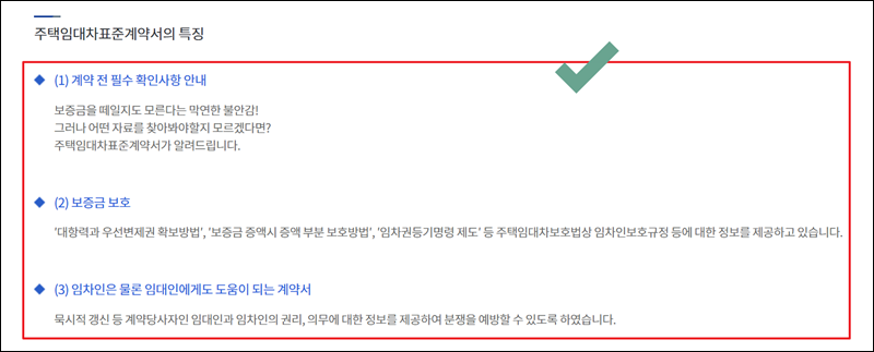 법무부에서 만든 표준계약서를 사용하면 좋은 점이 몇 가지 있어요. 특징을 통해 알 수 있는데요. 해당 양식에는 여러 가지 안내 및 설명이 포함되어 있고요. 보증금 보호를 위한 정보를 제공하고 있어요. 임대인과 임차인의 권리, 의무에 대한 정보 제공을 통해 분쟁 예방에 도움이 된다고 해요.