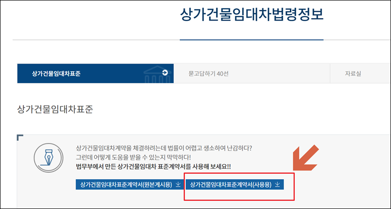 "법무/검찰" 메뉴를 클릭하면 상가건물 임대차 법령정보 페이지가 열리는데요. 해당 페이지를 보면 2개의 첨부 파일을 발견할 수 있을 거에요. 두 가지 모두 임대차 계약서에 관련된 것인데요. 부동산 계약서 양식이 필요하다면 "사용용"이라고 표기되어 있는 첨부파일을 다운 받으면 돼요.