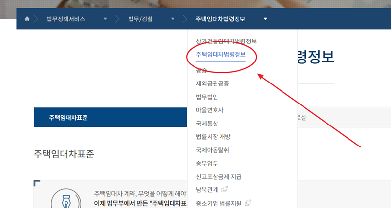 메뉴에서 "상가건물김대차법령정보"를 "주택임대차법령정보"로 변경해 주세요.