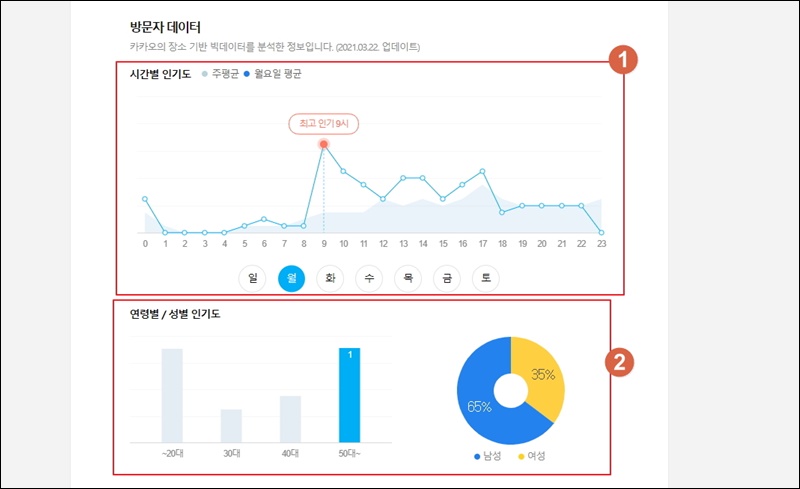 방문자 데이터를 통해 요일과 시간에 따라 사람이 방문자가 얼마나 많은지도 알 수 있고요. 연령별, 성별 인기도 확인도 할 수 있네요.