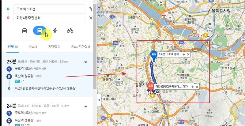 대중교통을 이용하는 경우 버스 또는 지하철을 통해 어떻게 가야 하는지 알 수 있어요. 요금과 소요시간도 나와 있고, 지도에 정확한 경로 표시가 되어 있기 때문에 가고자 하는 주소를 방문할 때 이용하면 정말 좋아요.
