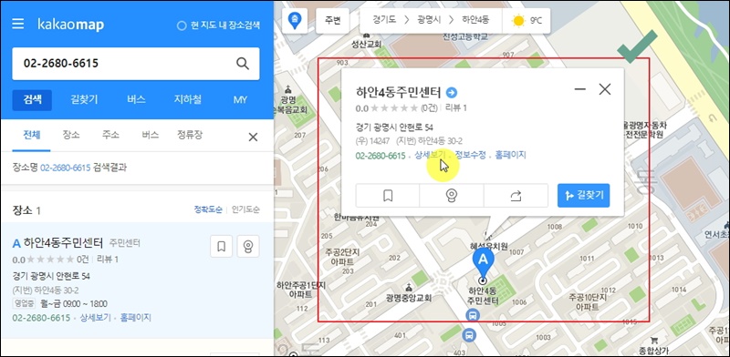 검색 결과가 바로 나오는데요. 해당 전화번호를 가진 공공기관, 가게 등을 지도 화면을 통해 알 수 있어요. 지도 화면을 통해 2가지 방법으로 주소찾기 가능한데요. 일단 시각적으로 지도에 표시가 되기 때문에 바로 알 수 있고요. 또 한 가지는 주소가 명확하게 표시되어 있어요. 도로명 주소와 지번 주소 2가지 모두 보이네요. 카카오맵에서는 이외에도 많은 정보를 제공하고 있는데요. "상세보기" 버튼을 눌러보세요.