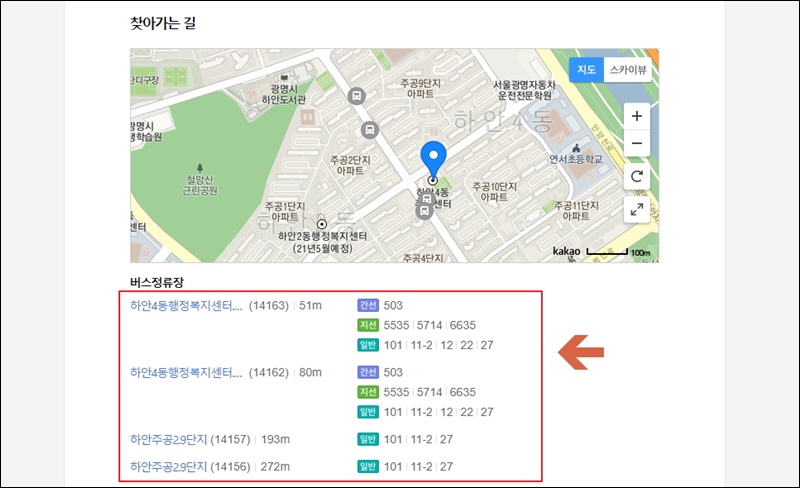 전화번호를 이용하여 주소찾기 뿐만 아니라 찾아가는 방법까지 안내 받을 수 있어요. 대중교통을 이용하는 경우 가까운 버스정류장을 쉽게 찾기 가능하도록 관련 정보를 제공하고 있어요.