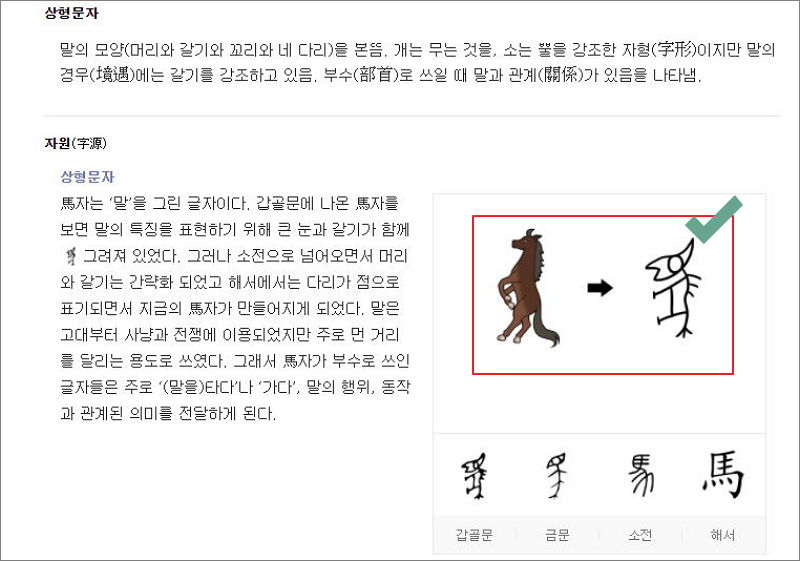 ▼ 한자는 특정 대상의 형상을 본떠서 만들어진 것이 많습니다. 한자 써서 찾기를 통해 상형문자와 자원도 알아볼 수 있습니다.