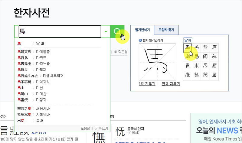 ▼ 저는 주로 네이버 사전 사이트를 이용합니다. 여기에서 사용할 수 있는 필기 인식기의 성능이 매우 뛰어나기 때문입니다. 저처럼 글씨를 예쁘게 쓰지 못하는 경우에 사용하면 좋습니다. 프로그램이 알아서 제가 찾으려고 한 문자로 인식해 주기 때문입니다.