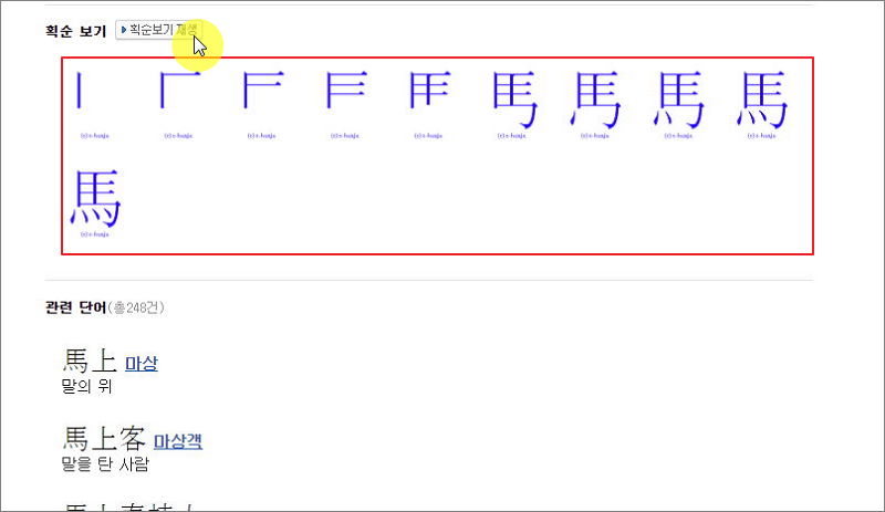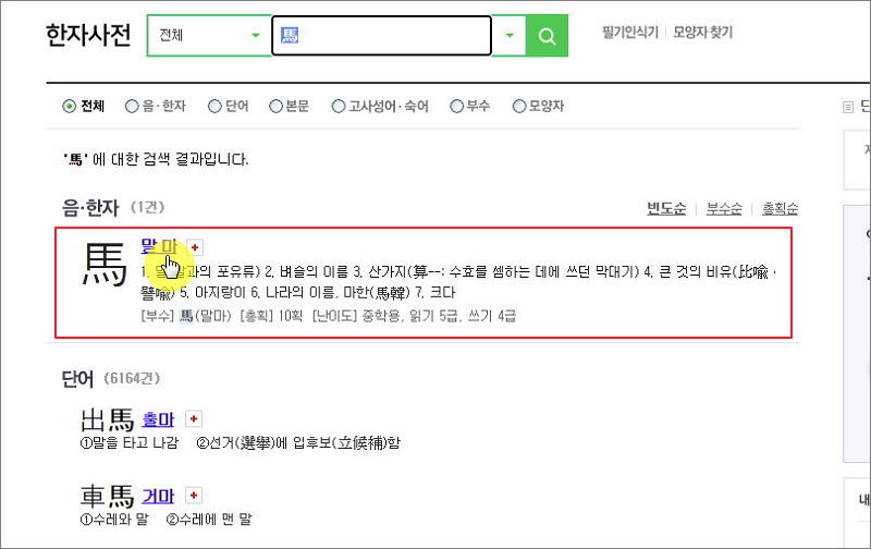 ▼ 검색 버튼을 누르면 한자 찾기에 대한 결과를 확인할 수 있습니다. 제가 찾으려고 했던 "말 마"자가 보입니다. 클릭하면 좀 더 상세한 사전정보를 얻을 수 있습니다. 참고로 해당 사이트에서 한자를 검색하면 해당 문자가 포함된 단어, 본문, 고가성어, 부수 등도 검색이 됩니다. 학습용으로 사용하기에 좋은 기능입니다.