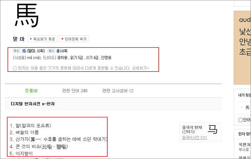 ▼ 한자 찾기에 대한 결과가 나타났습니다. 여러 가지 많은 뜻과 함께 부수, 획수, 사성음, 난이도, 획순을 알아볼 수 있습니다. 온라인 사전 특성상 옥편보다 많은 내용을 담을 수 있습니다. 그렇기 때문에 폭넓고, 깊이 있게 알아보려면 온라인 사전을 이용하는 것이 낫습니다.