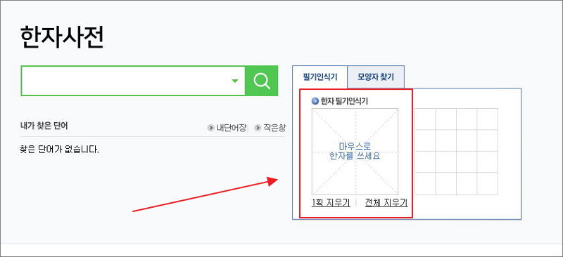 ▼ 한자사전 페이지에 접속했습니다. 검색창 옆을 보면 한자 필기인식기가 있습니다. "마우스로 한자를 쓰세요."라고 표시되어 있는 부분에 찾고자 하는 한자를 그려 넣으면 됩니다.