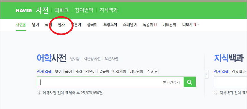▼ 네이버 사전 사이트에 접속하면 여러 가지 사전 서비스가 나타납니다. 여기에서 메뉴에 있는 "한자"를 클릭하면 우리가 원하는 서비스를 이용할 수 있습니다.