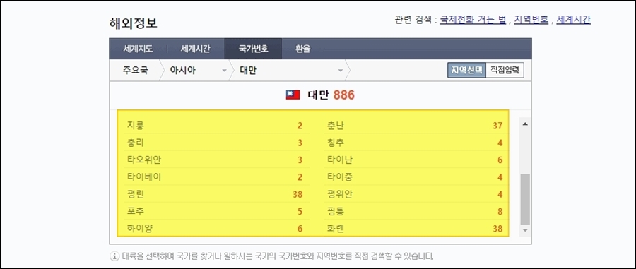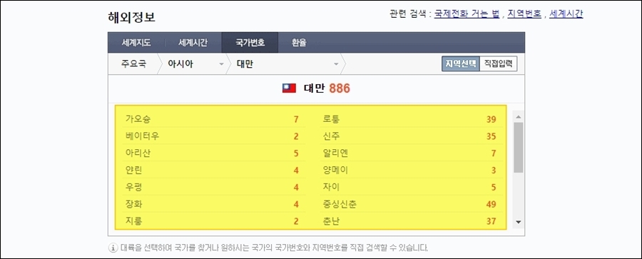 네이버의 국제전화 국가번호 페이지에서 대만을 클릭하면 모든 지역에 대한 번호 확인이 가능합니다.
