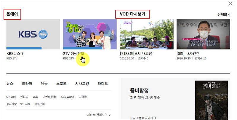 ▼ 새롭게 열린 전체 메뉴 창에서 보면 온에어, VOD 다시보기가 나타납니다. 온에어는 생방송을 실시간으로 볼 수 있는 서비스입니다. VOD 다시보기의 경우에는 지난 방송을 다시 볼 수 있습니다. 생방송으로 kbs2 tv 보기 위에서는 온에어에서 KBS 2TV 버튼을 클릭하면 됩니다.