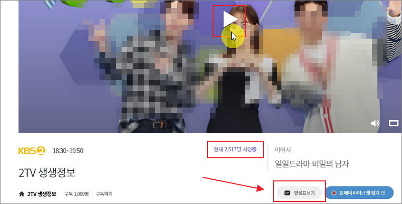 ▼ 현재 kbs2 채널에서는 생생정보 프로그램이 방영되고 있습니다. 새롭게 이동한 페이지에서 재생 버튼을 클릭하면 바로 tv 프로그램을 시청할 수 있습니다. 재생 플레이어 아래를 보면 현재 2,517명이 시청 중으로 표시되고 있습니다. 제가 알려드린 방법을 통해 온라인으로 kbs2를 시청하는 사람의 수가 이정도 된다고 보시면 됩니다.