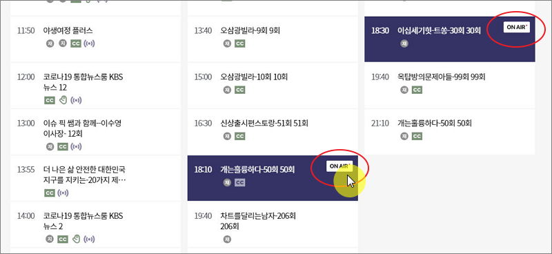 ▼ 편성표를 아래로 내려보면 현재 시각에 방영되고 있는 프로그램을 찾을 수 있습니다. 여기에서 ON AIR 표시가 되어 있는 것을 클릭하면 바로 보기 가능합니다.