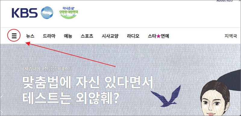 ▼ kbs 사이트에 접속했습니다. 뉴스, 예능, 스포츠, 시사교양, 드라마 등 다양한 프로그램을 제공하고 있습니다. 메뉴에서 가장 왼쪽을 클릭해 보시길 바랍니다. 전체 메뉴가 펼쳐질 것 입니다.