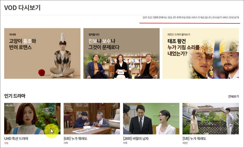 ▼ 다시 보기 서비스의 경우 이렇게 프로그램 별로 구분되어 있습니다. 자신이 좋아하는 프로그램을 찾아서 연달아 볼 수 있다는 장점이 있습니다. 일부 프로그램의 경우에는 방송 3주 후에 무료 VOD 서비스가 제공됩니다. 다시 보기 서비스를 이용할 때 참고하시길 바랍니다.
