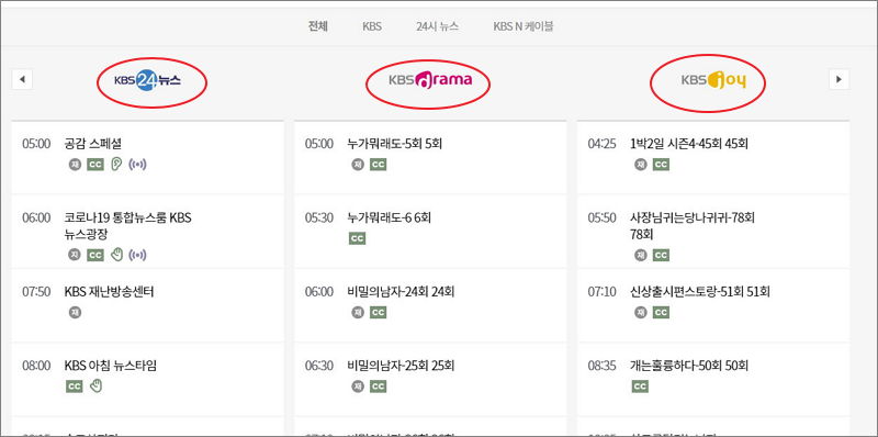 ▼ 더 많은 tv 채널을 시청하는 방법을 알려드리겠습니다. 편성표 보기 버튼을 클릭하면 이렇게 여러 채널의 편성표를 확인할 수 있습니다. 정규 채널 외에도 kbs24뉴스, kbs드라마, kbsJOY 채널을 만나볼 수 있습니다.