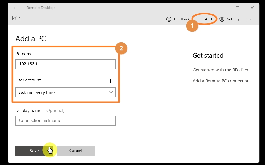 다음은 프로그램을 처음 실행한 후 메뉴에 있는 [Add]를 선택한 화면입니다. 새롭게 이용할 원격제어 설정값을 저장하는 과정인데요. 여기에서 PC name에는 연결할 컴퓨터의 IP를 입력하면 됩니다. 현재 사용하는 컴퓨터와 내부적으로 네트워크 연결이 되어 있는 상태라면 자신이 사용하는 공유기 페이지에서 내부IP 주소를 확인하면 되고, 다른 공간에 있는 PC에 연결하는 경우라면 외부IP 주소를 입력하면 됩니다. 그 다음에는 유저 아이디와 비밀번호를 입력하면 되는데요. 보안을 위해 "Ask me every time"으로 지정해 놓고, 연결을 시도할 때마다 수동으로 로그인을 하는 방식이 좋습니다.