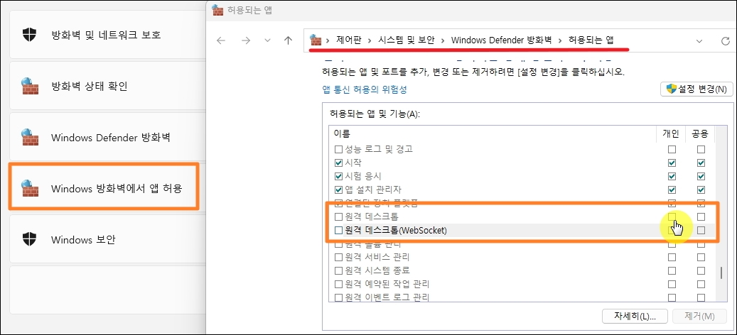 원격제어는 네트워크를 이용하는 작업이기 때문에 상대측 컴퓨터의 방화벽에 막힐 수 있습니다. 이런 경우는 [제어판]에서 [Widows 방화벽에서 앱 허용]을 선택해 주세요. 그 다음 허용되는 앱 및 기능 목록에서 [원격 데스크톱]을 찾아 체크해주면 됩니다.