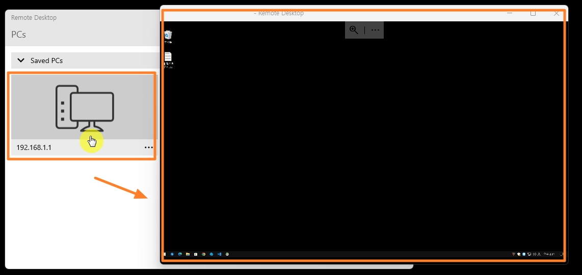 설정한 값을 저장한 후, Remote Desktop 프로그램에서 해당 원격제어 설정값을 클릭해 보세요. 그럼 새로운 창이 열리면서 원거리에 있는 컴퓨터의 화면이 나타납니다. 이 때 상대측 컴퓨터가 켜진 상태이어야 합니다. 연결 버튼을 클릭했음에도 다음과 같은 화면이 나타나지 않는다면 다음 단계에서 알려주는 내용을 참고하시길 바랍니다.