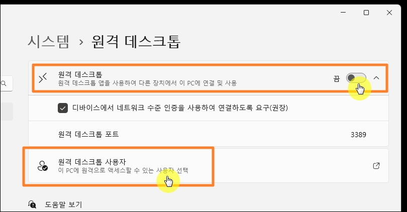 원격 데스크톱 페이지가 열리면 "원격 데스크톱 앱을 사용하여 다른 장치에 이 PC에 연결 및 사용"에 관한 체크 박스가 있습니다. 이 부분이 "끔"으로 되어 있다면 클릭하여 "켬"으로 변경해 주세요. 그리고 원격제어 연결 시 로그인에 문제가 있다면 [원격 데스크톱 사용자] 메뉴를 클릭합니다.