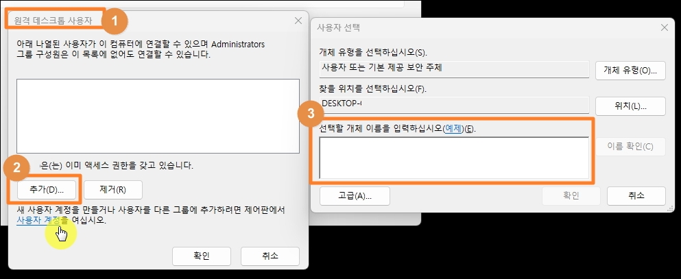 해당 컴퓨터에 대한 Remote Desktop 앱의 엑세스 권한을 가진 계정을 만들 수 있는 창이 열리는데요. 연결을 시도할 때 로그인에서 막히는 경우 여기서 새로운 계정을 추가하면 됩니다.