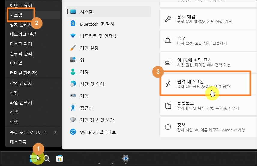 제가 알려드린 컴퓨터 원격제어 방법을 처음 진행할 때에 한 번에 순조롭게 연결이 되지 않을 수 있습니다. 그 이유는 상대측 컴퓨터에서 원격제어에 대한 "연결 권한"에 대한 설정이 사전에 되어 있어야 하기 때문입니다. 제어판에서 간단히 해당 설정을 진행할 수 있습니다. 제어판을 실행한 후 [시스템] 카테고리에서 [원격 데스크톱] 메뉴를 선택합니다.