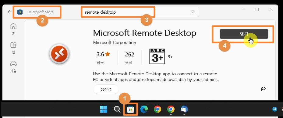 국내에서 가장 많이 사용하는 윈도우 운영체제를 기준으로 설명해 드리겠습니다. 제가 다양한 원격제어 방법을 사용해본 결과, 마이크로소프트 스토어에서 무료로 다운 받아 사용할 수 있는 "Microsoft Remote Desktop" 프로그램이 가장 만족도가 높았습니다. 사용하기도 쉽고, 속도가 빨라서 렉 없이 사용할 수 있거든요. 저는 업무용으로 이 방법을 자주 사용하고 있습니다. 스토어 앱을 통해 해당 프로그램을 설치해 주세요.