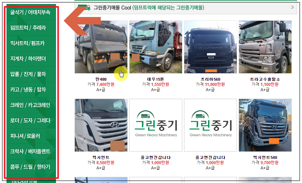 2. 그린중기 매매상사 사이트에 접속하면 좌측에 여러 중장비 종류가 나타납니다. 굴삭기, 덤프트럭, 펌프카, 지게차, 하이랜더, 카고, 탑차, 카고크레인, 로울러, 배차플랜트 등 다양한 중장비 매물을 찾아볼 수 있죠. 사진과 가격 그리고 상태 등급을 간단하게 볼 수 있도록 표로 정리가 되어 있네요.