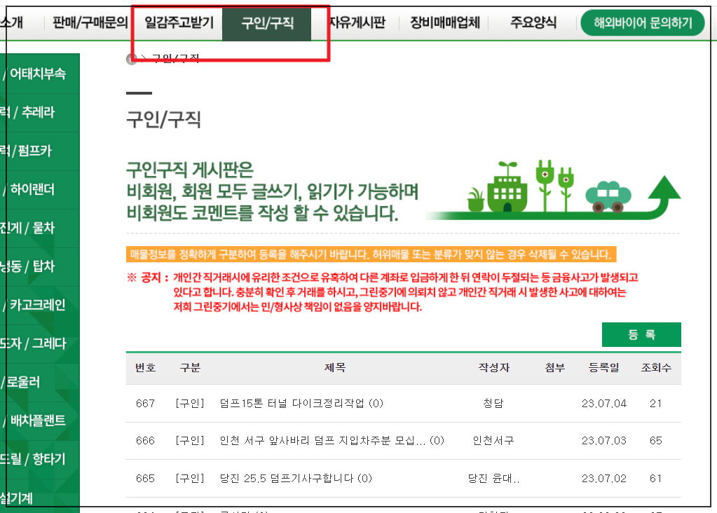 1. 그럼 그린 중기와 함께 중장비 거래에 도움이 되는 매매상사 사이트를 몇 가지 알려드리도록 하겠습니다. 가장 먼저 그린중기 인데요. 많은 방문자수를 자랑하는 곳인 만큼 정보를 얻기에 정말 좋습니다.