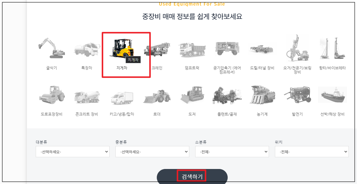6. 중장비매매 정보를 쉽게 찾아 볼 수 있는 사이트 인데요. 굴삭기, 특장차, 지게차, 크레인, 덤프트럭, 도저, 로더, 카고, 콘크리트 장비, 도로포장장비 등 여러 가지를 선택할 수 있습니다. 찾고자 하는 중장비를 선택한 후 검색하기 버튼을 눌러 주세요.