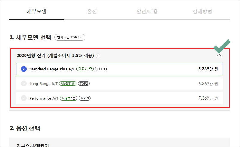 ▼ 이번에는 차종, 연료 타입, 주행 지원 옵션, 평의 장치 옵션을 선택할 차례입니다. 아직 SUV는 나오지 않았고, 준중형이나 중형, 중대형 중에서 선택하면 될 듯 합니다. 전기차 종류가 많지 않기 때문에 아무것도 선택하지 않아도 괜찮습니다.